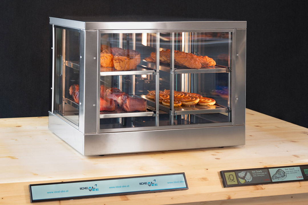 Die schlanke Auftischvitrine sichert die Temperatur der Speisen zuverlässig und garantiert dem Kunden somit den optimalen Frischegenuss.